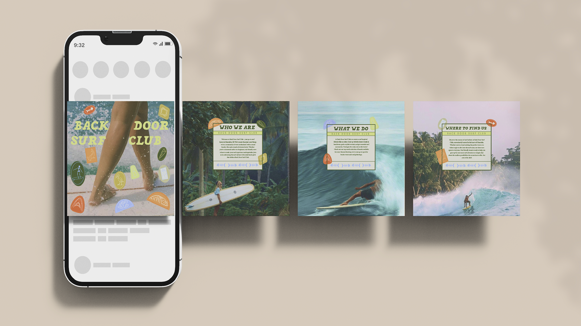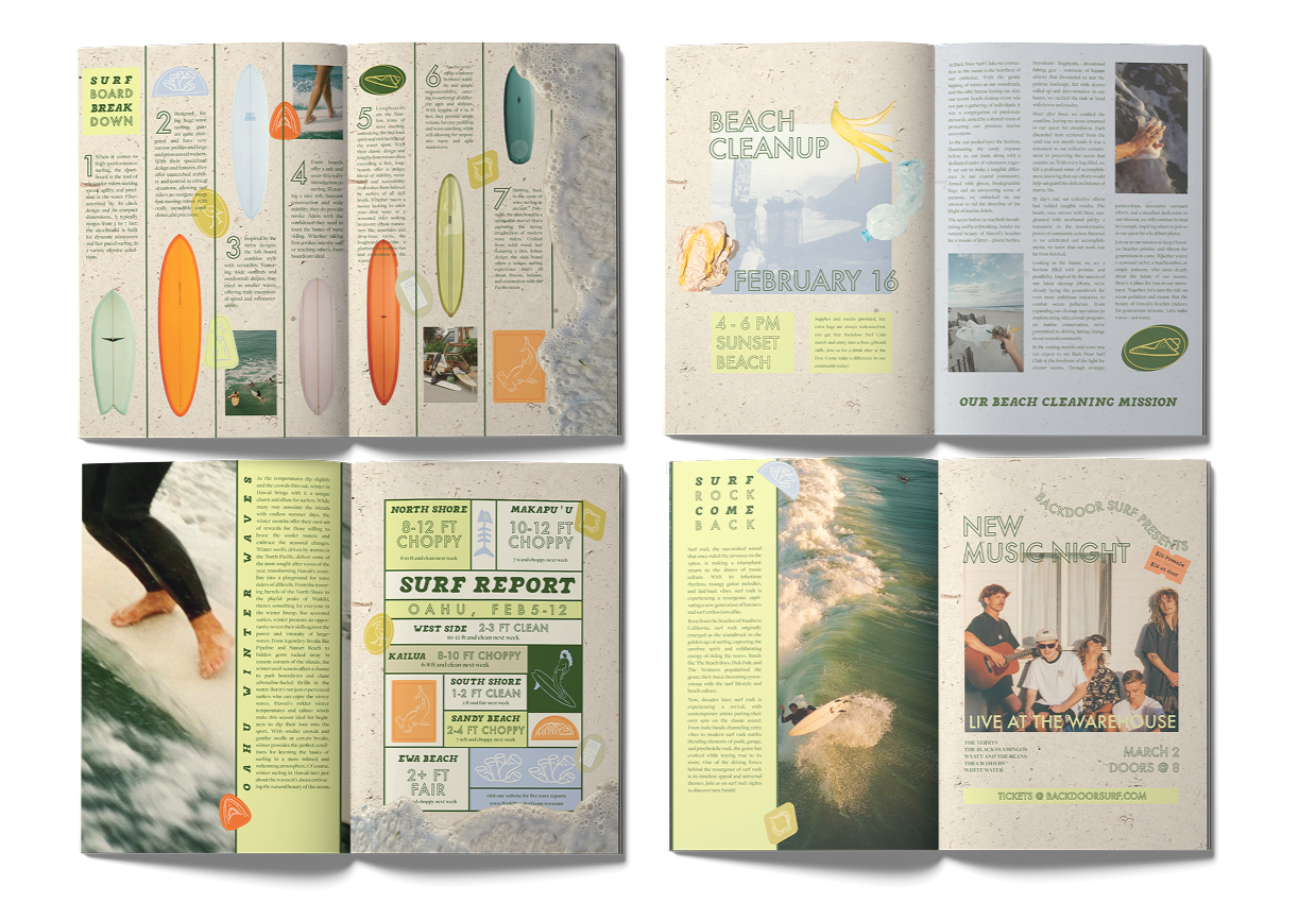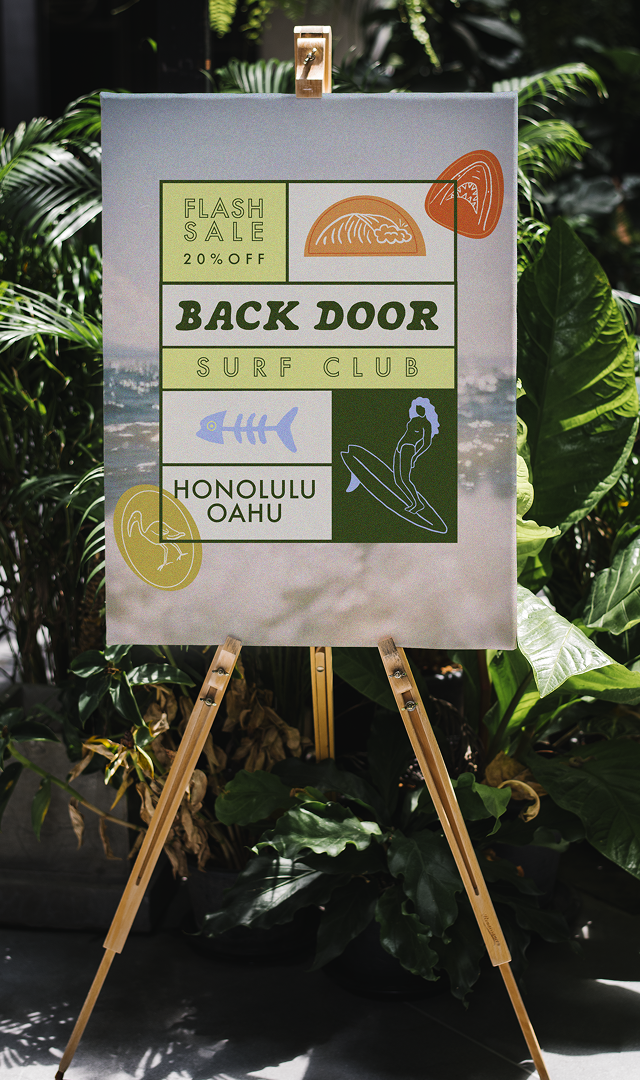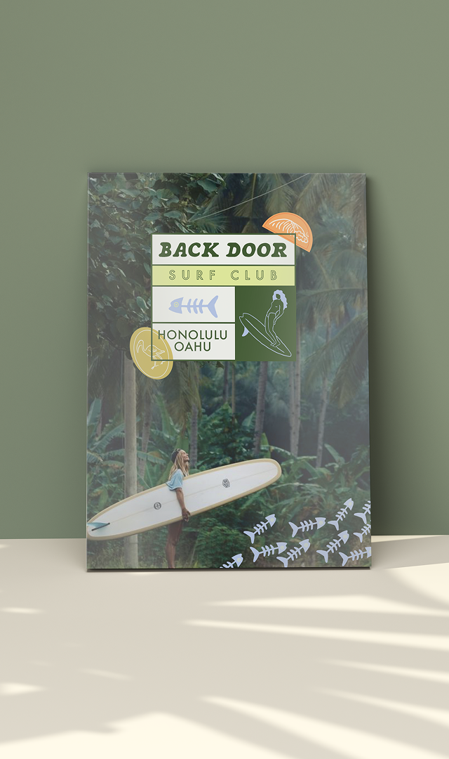 The Back Door Surf Club branding project aimed to marry the vibrant, laid-back atmosphere of Hawaiian surf culture with a touch of upscale sophistication. Deliverables included a comprehensive branding guide, merchandise, social media posts, signage, and a zine. The result is a cohesive brand identity that resonates with boutique surf enthusiasts.
