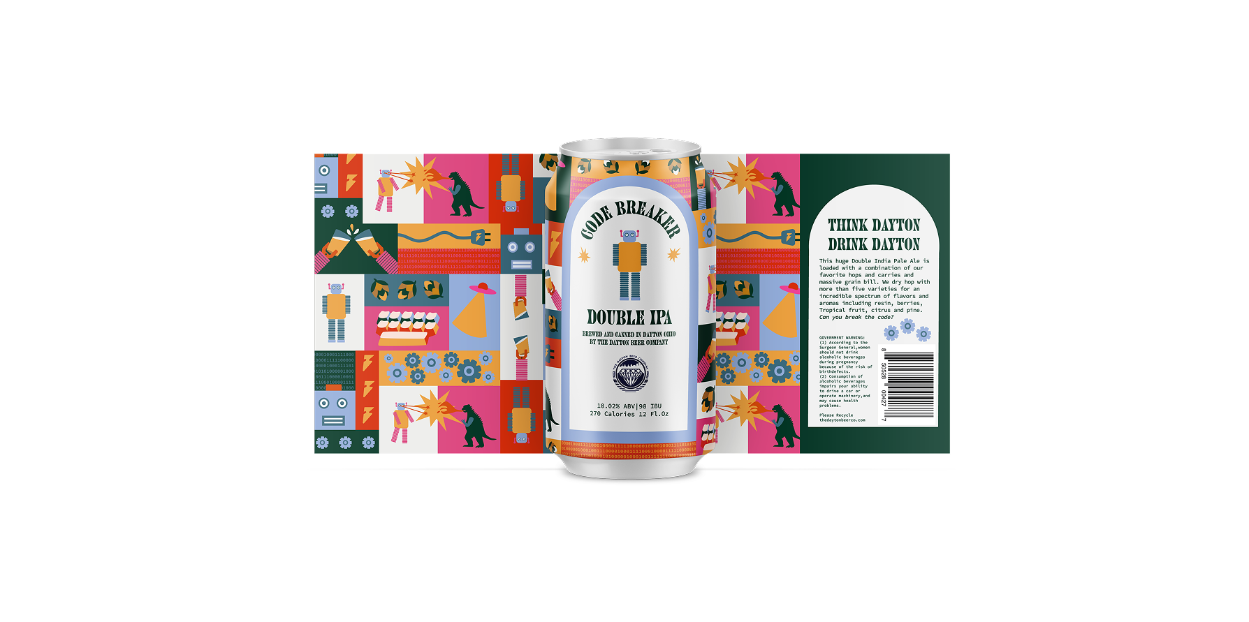 For the Dayton Beer Company's "Code Breaker: Double IPA," I created a captivating can design and table tent that would stand out on shelves and tables alike. Inspired by a fusion of robots and beer, I crafted a bright, funky pattern bursting with playful details.
