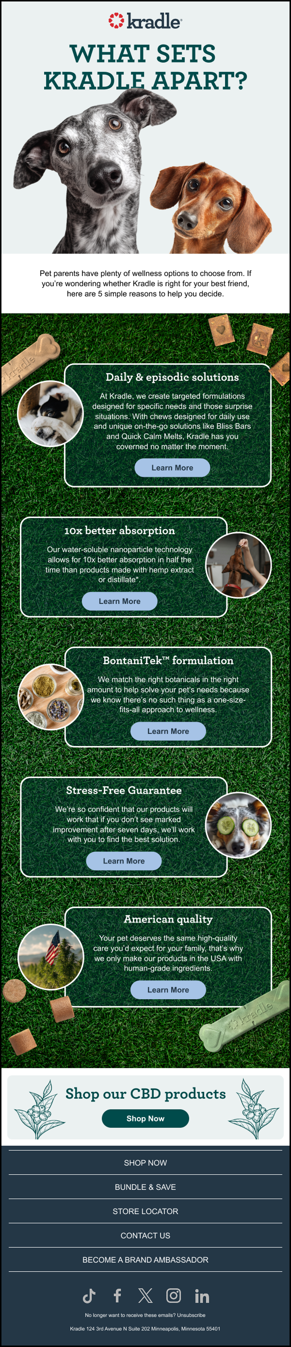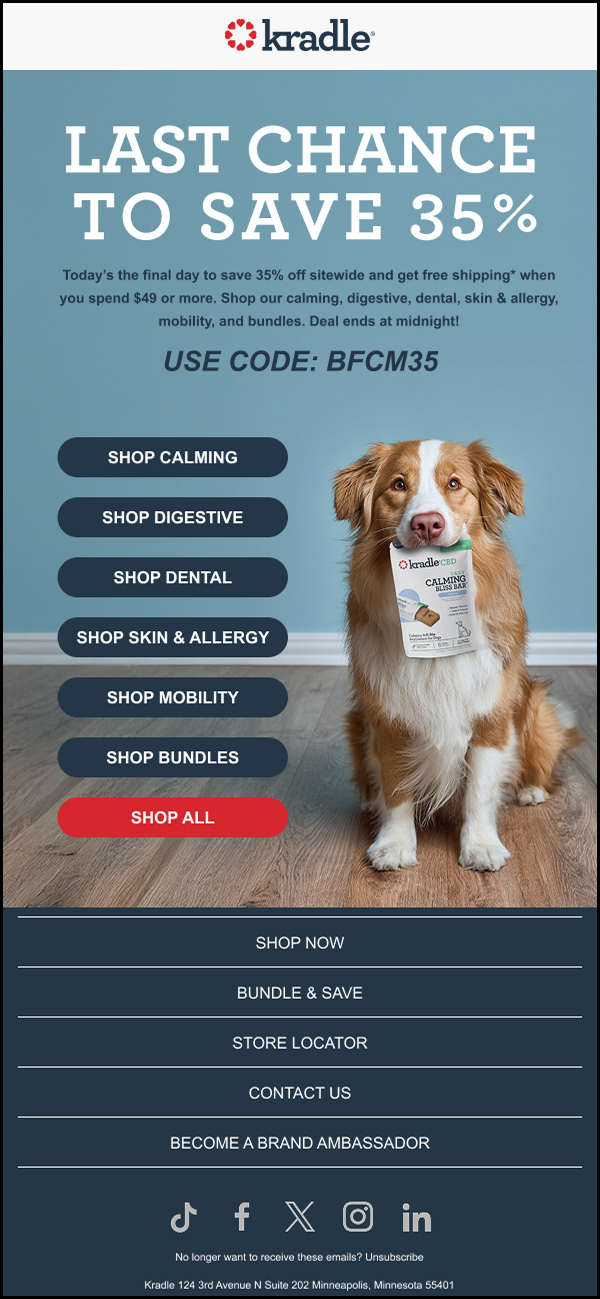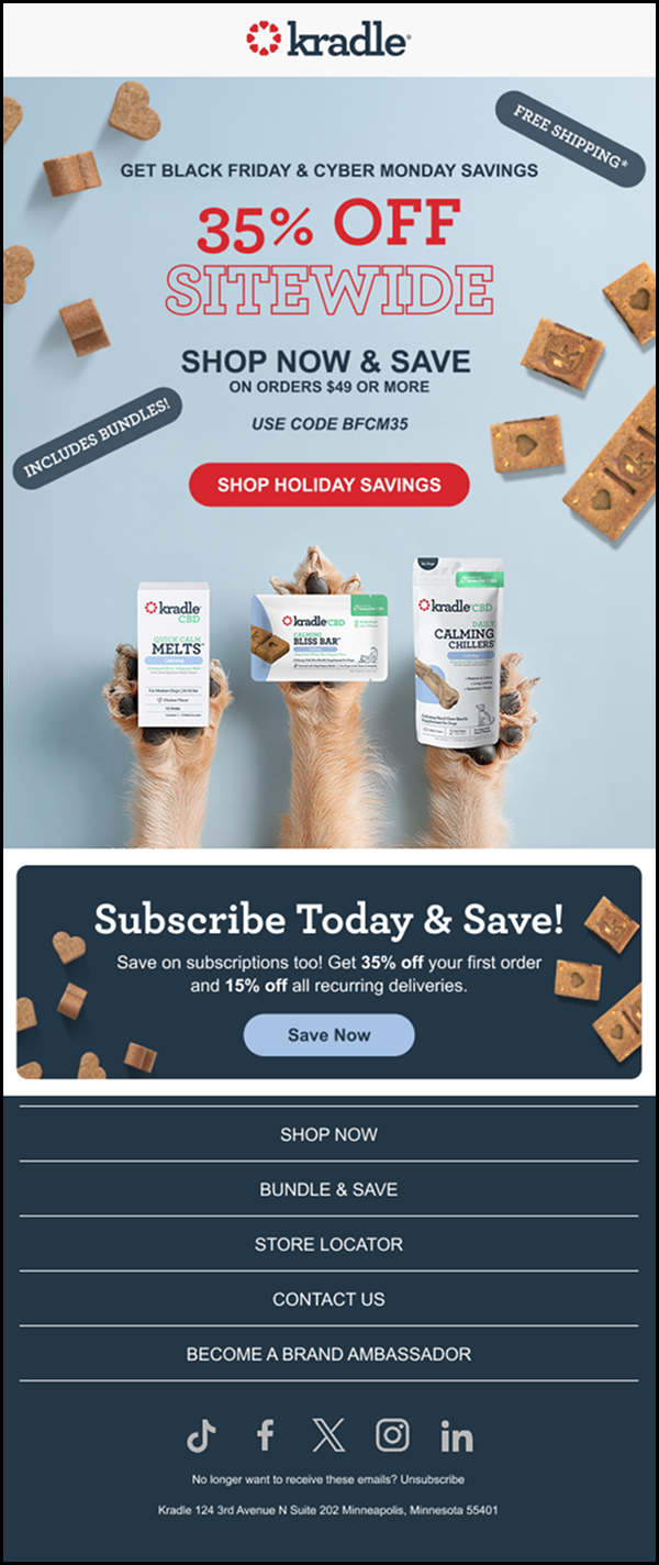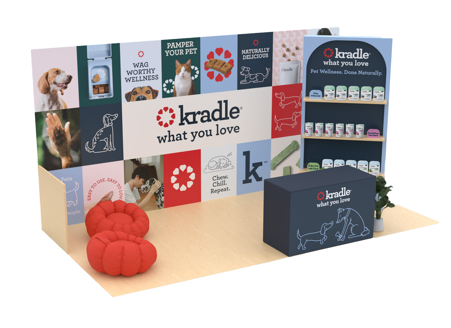 I worked with Kradle, a CBD dog treat company, for over a year managing and designing their email marketing. I built a scalable CRM system and streamlined their email design and production process, creating templates and workflows that improved efficiency and consistency across campaigns. In addition to email, I designed a tradeshow booth that translated Kradle’s brand into a bold, physical space, helping them stand out in a crowded expo environment.