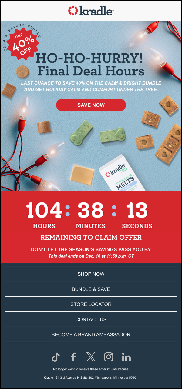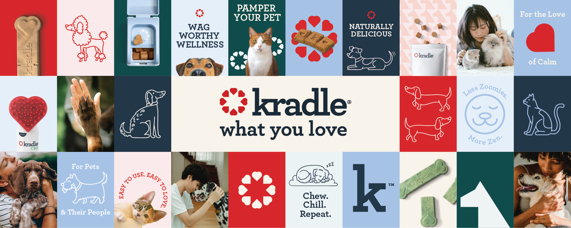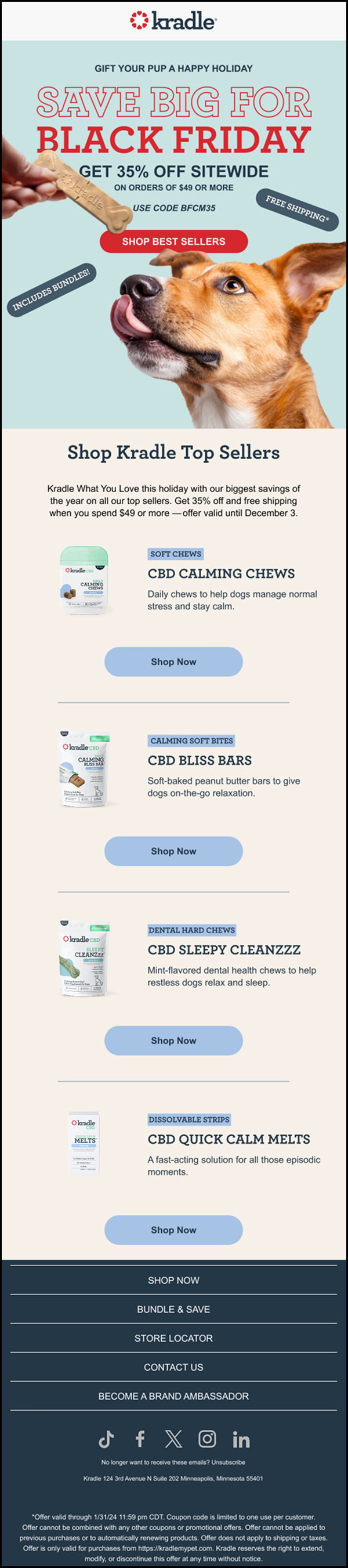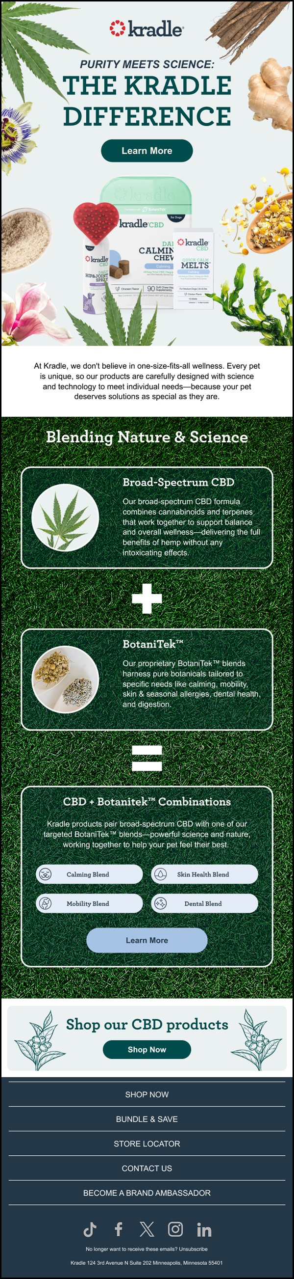 I worked with Kradle, a CBD dog treat company, for over a year managing and designing their email marketing. I built a scalable CRM system and streamlined their email design and production process, creating templates and workflows that improved efficiency and consistency across campaigns. In addition to email, I designed a tradeshow booth that translated Kradle’s brand into a bold, physical space, helping them stand out in a crowded expo environment.
